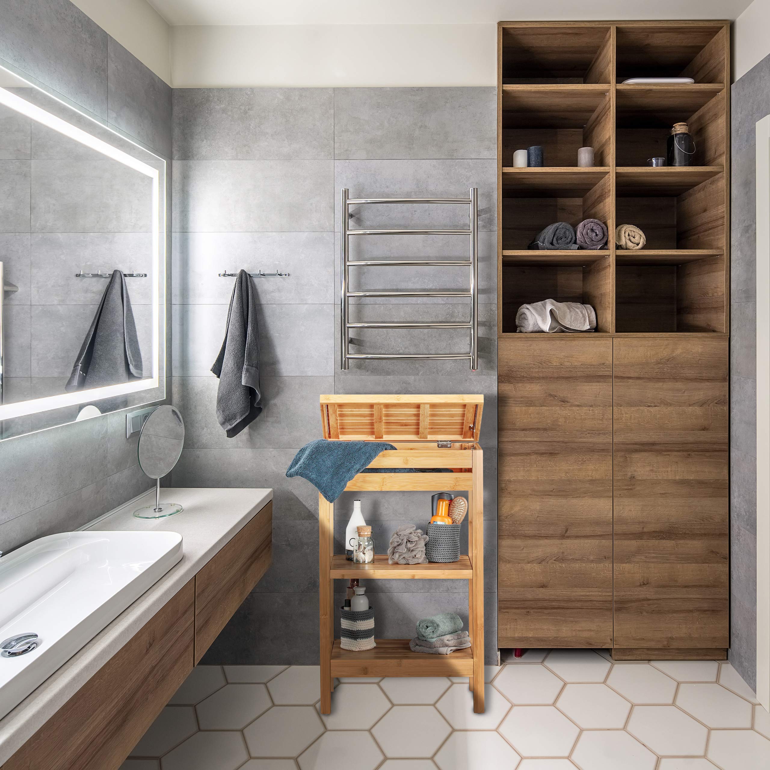 Viel Stauraum: Das Badregal bietet ausreichend Platz mit 2 offenen Fächern und 1 Fach mit Klappe